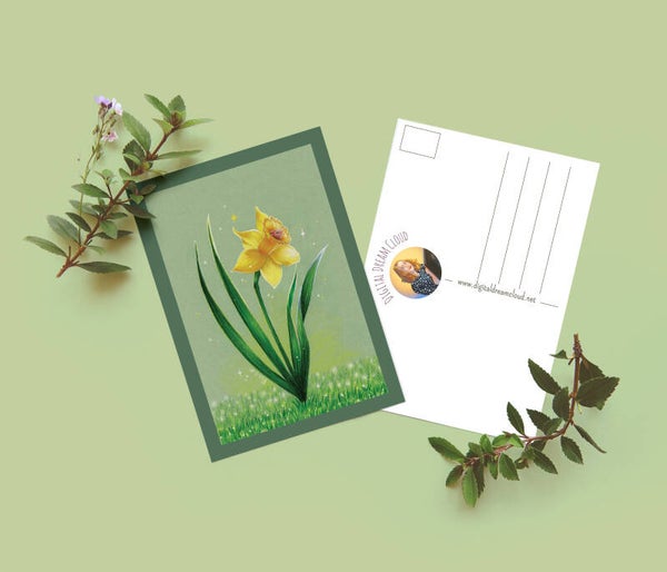 potlood kaart | cottagecore kaart | goblincore kaart narcis | bloemen kaart | dieren verjaardags kaart | handgemaakte kaart | lieve dieren kaart | schattige dieren