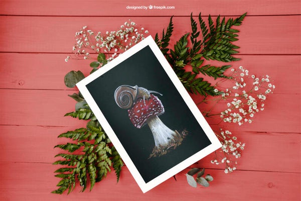 Orginele illustratie is gemaakt met Faber-castell potloden op zwart papier. Voor de paddestoelen liefhebber, of de slak die van paddestoelen houd. Orgineel is ingescanned en daarna op getextureerd papier uitgeprint.