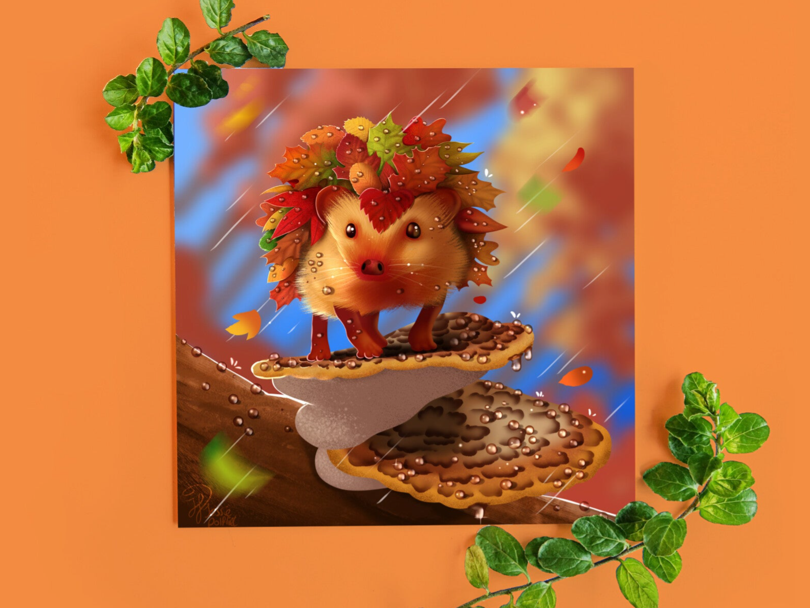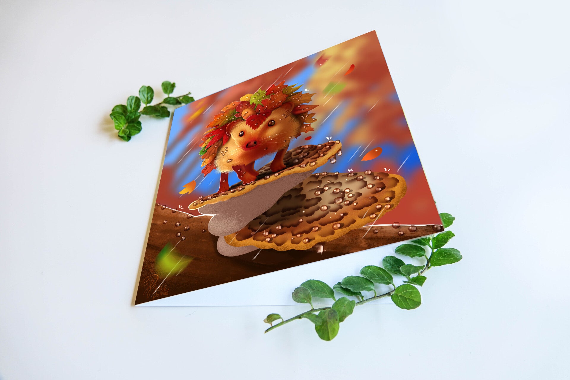 Autumn leaveshog egel kaart 135x135 mm gevouwen.