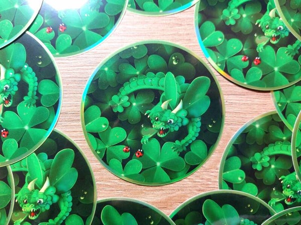 Een klaver draak sticker met holografisch effect. Perfect voor journaling, scrapbooking of als kado voor jouw vriend die van draken houd.