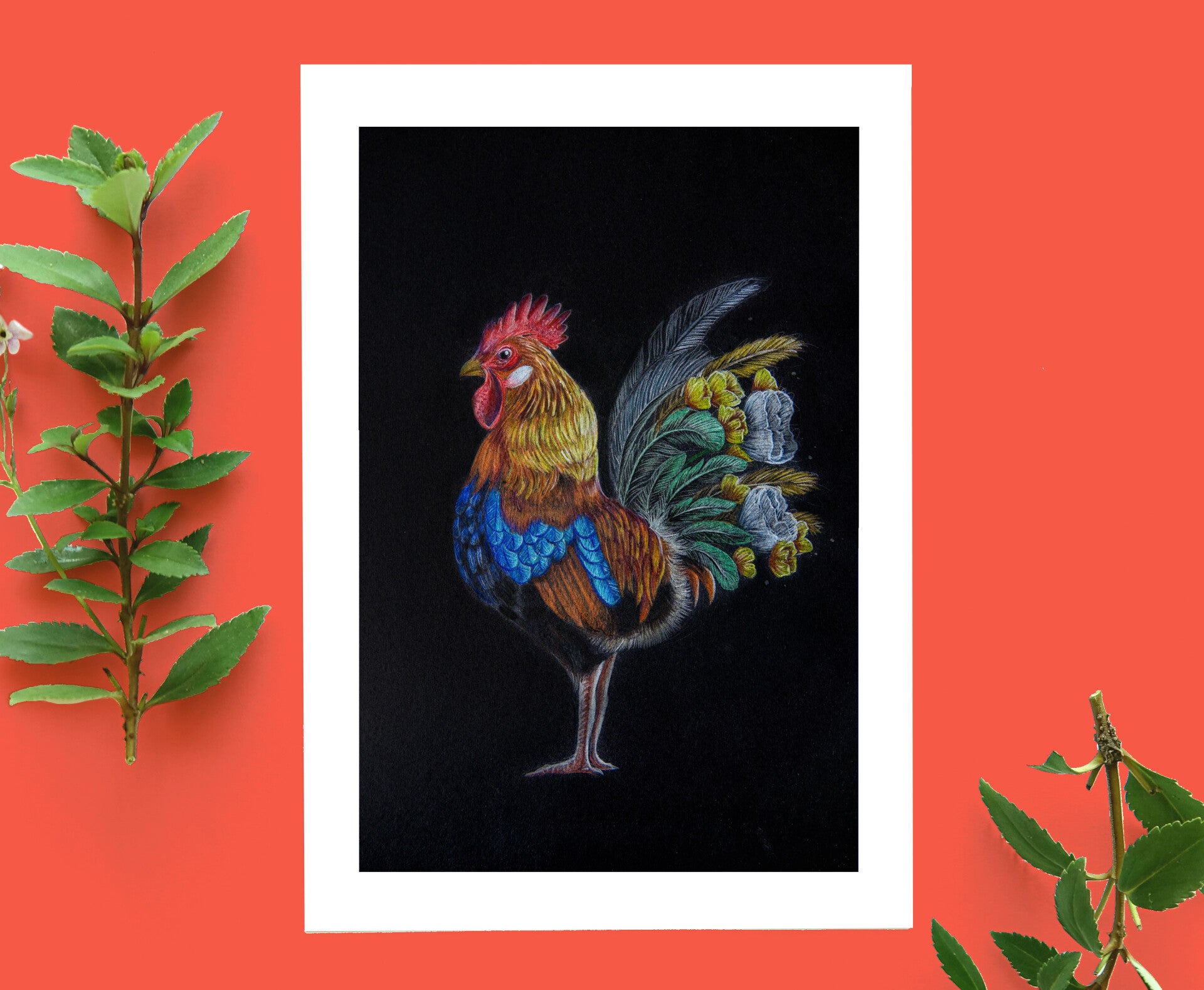 Een fleurige haan met potlood getekend op zwart papier.