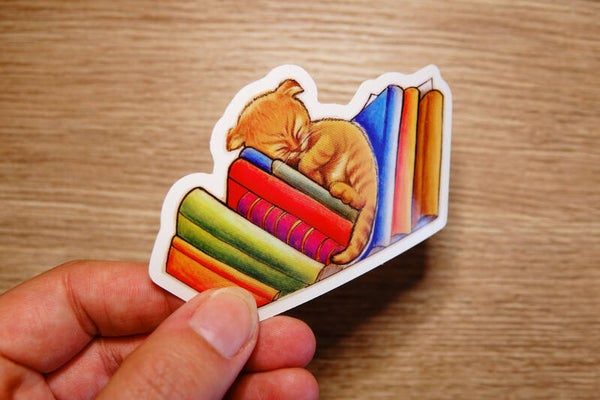 Een lieve kitten die slaapt tussen de boeken. STICKER IS VAATWASSER BESTENDIGKitten, kat, kattensticker, boekenliefhebber, kado voor lezer, kado voor haar, laptopdecoratie, telefoon decoratie, e-reader decoratie9.5x5.8 cm