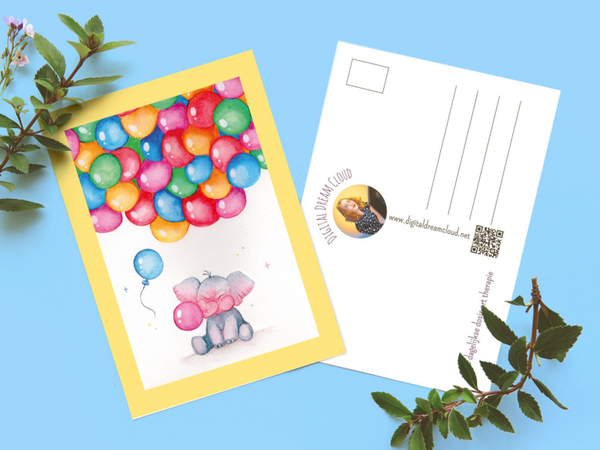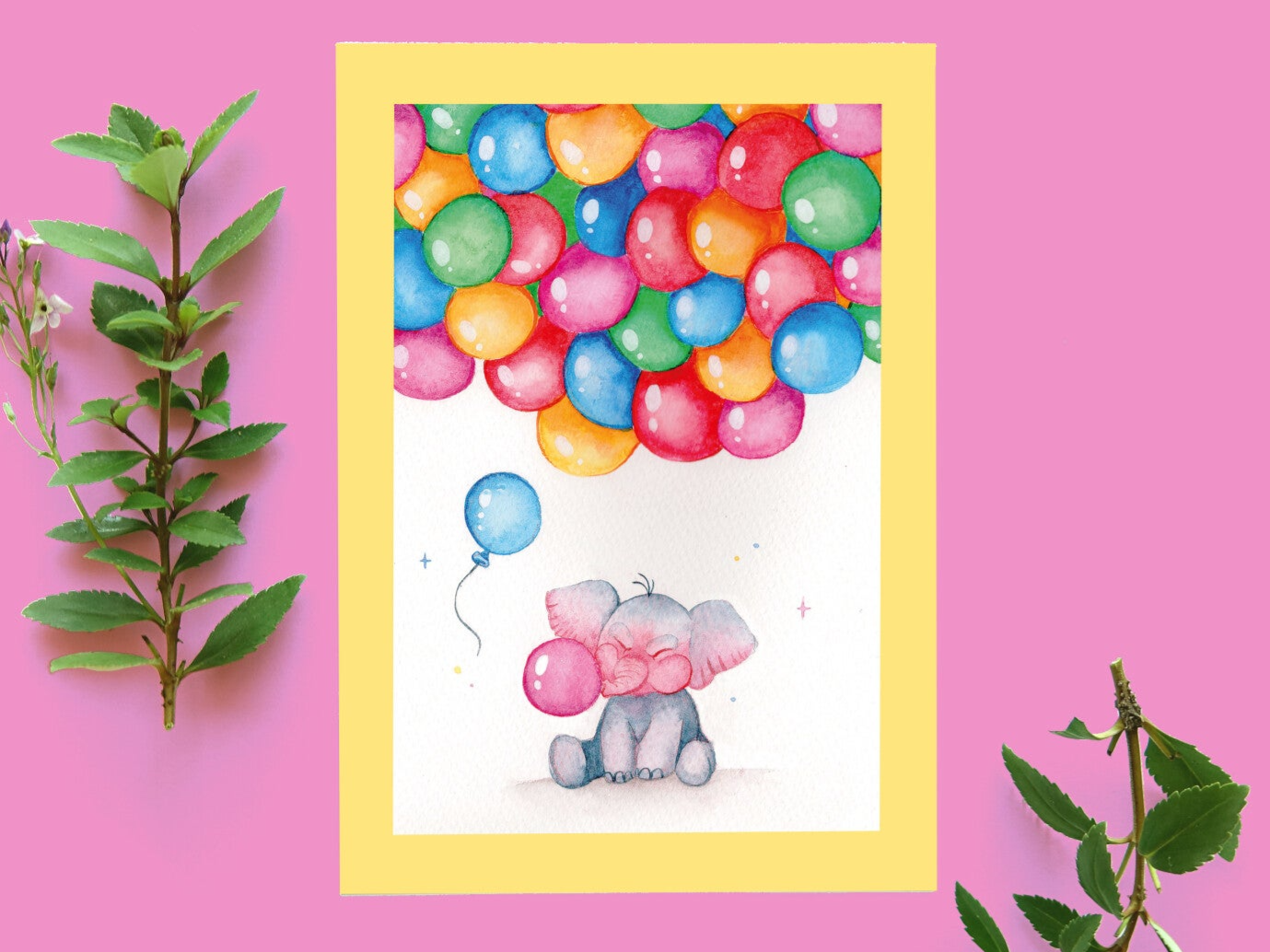 olifanten | balonnen | kinderen | kinder verjaardags kaart | waterverf