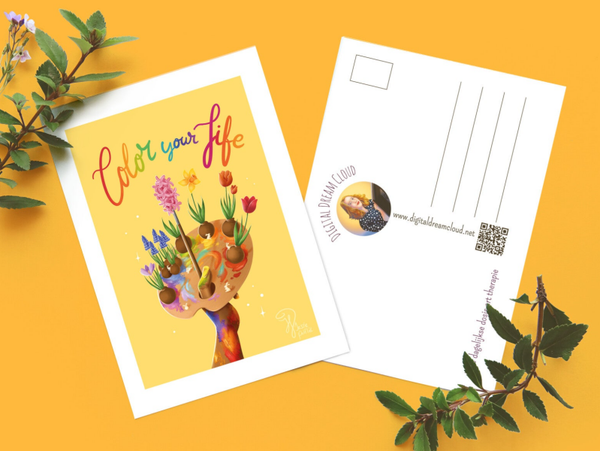 A6 formaat (randloos), in kleur dubbelzijdig geprint op 270 grams klassiek tinteretto gesso papier. Heeft een textuur dat lijkt op waterverf papier.