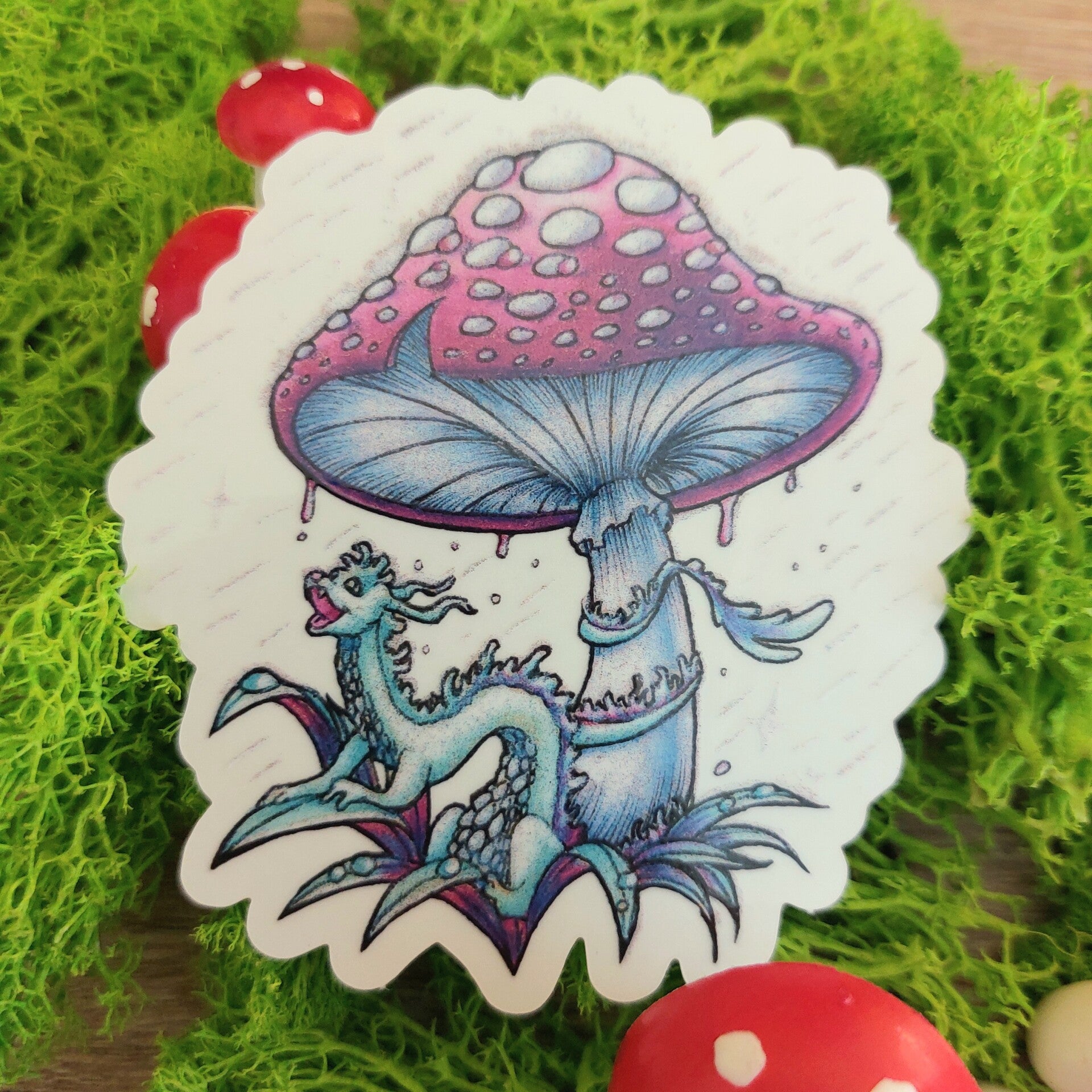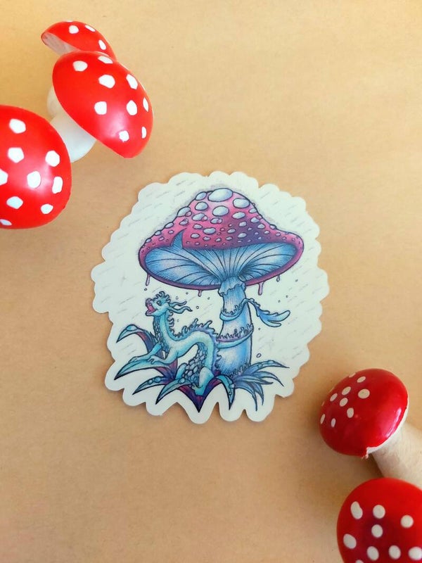 Paarse paddestoel draak sticker Transparant / Glanzend 7.4x8 cm
