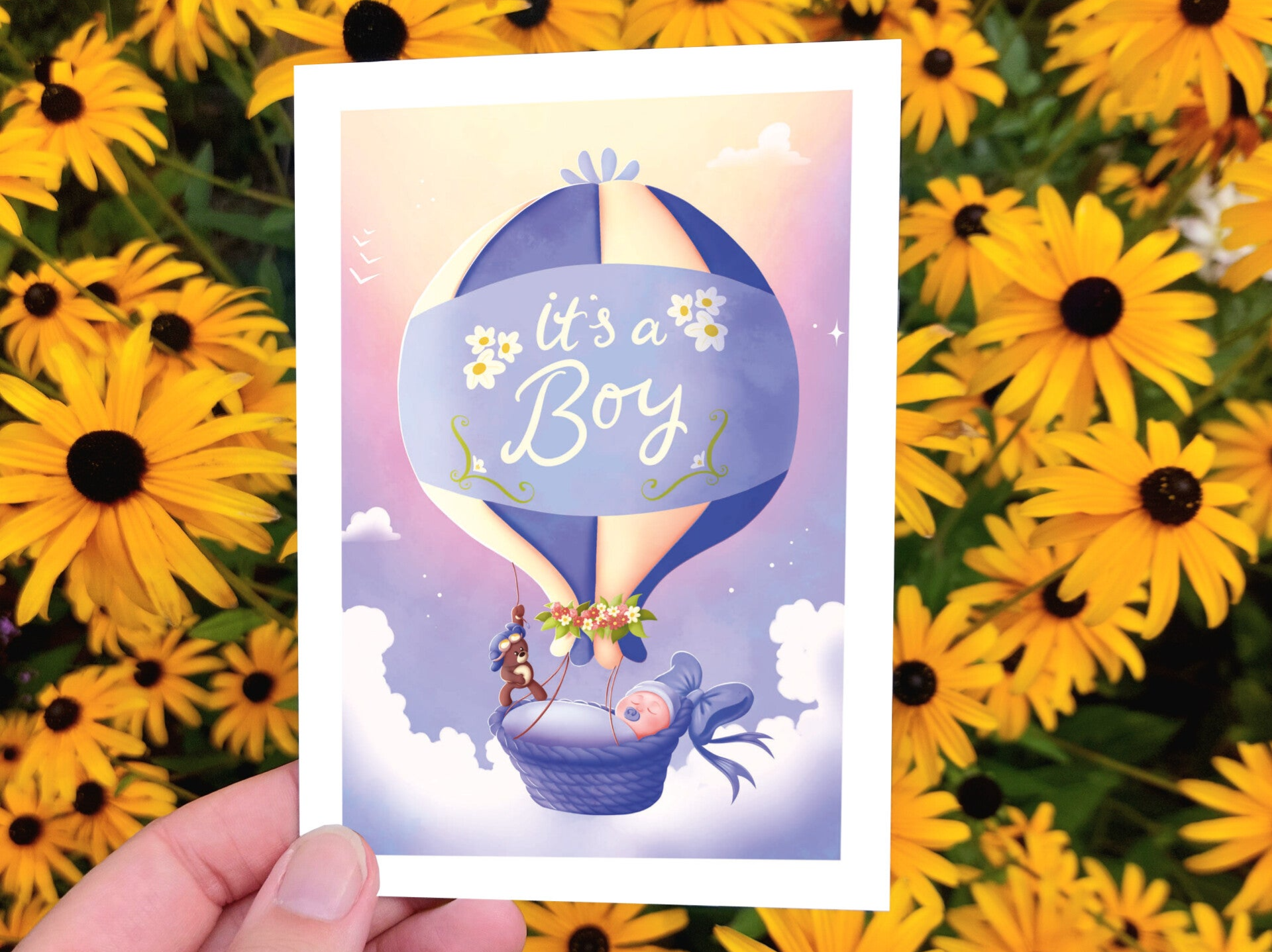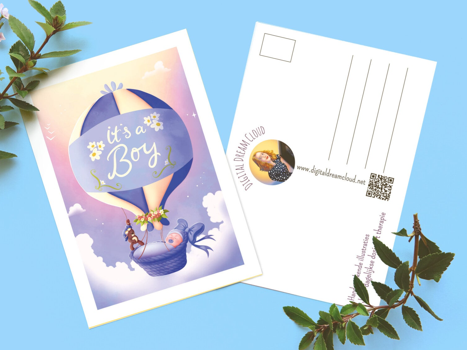 baby kaart | geboorte kaart | jongen | luchtballong | teddybeer| gefeliciteerd |verjaardags kaart | wenskaart | ansicht kaart | digitale illustratie | kaart