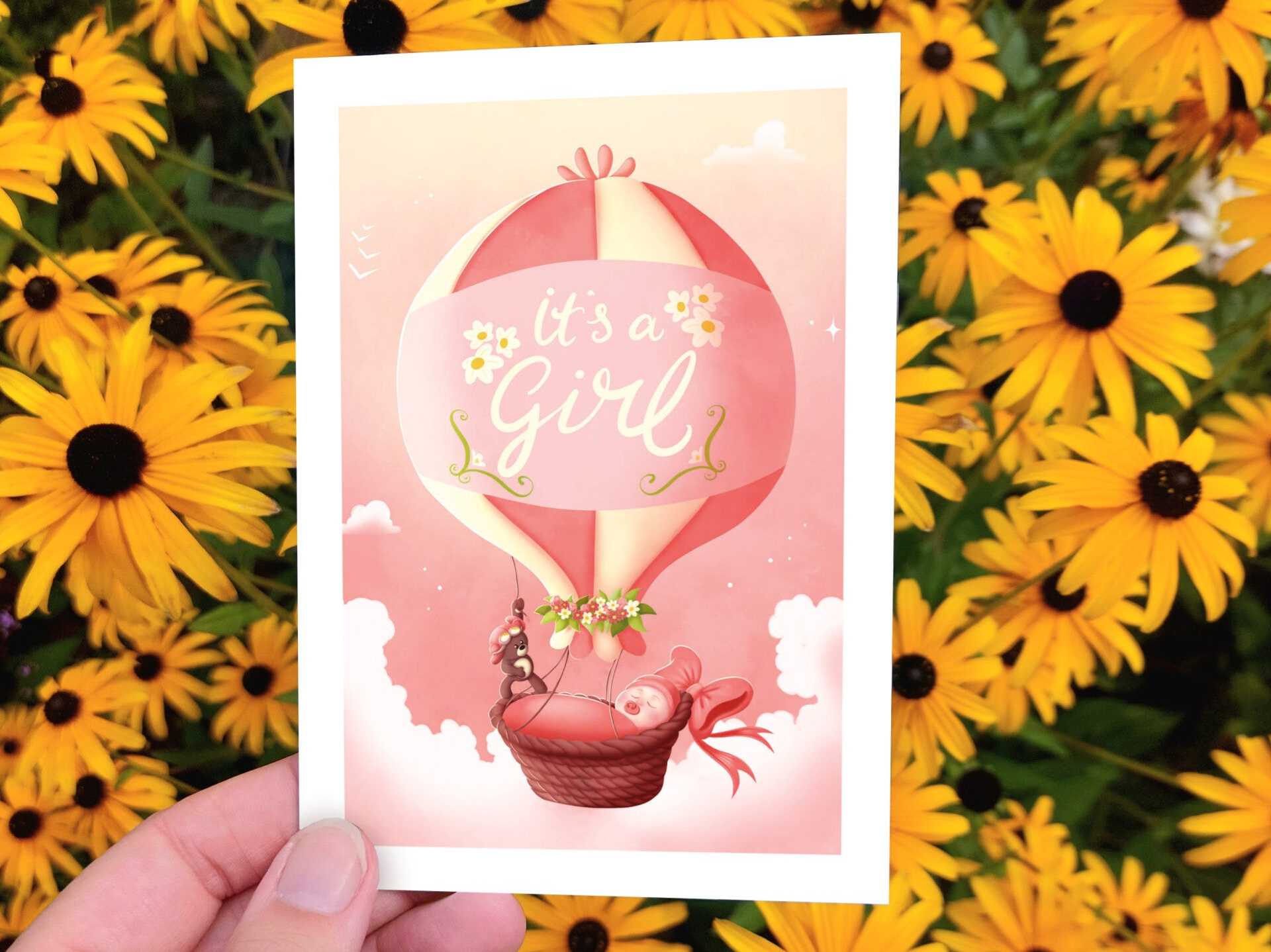 baby kaart | geboorte kaart | jongen | luchtballong | teddybeer| gefeliciteerd |verjaardags kaart | wenskaart | ansicht kaart | digitale illustratie | kaart