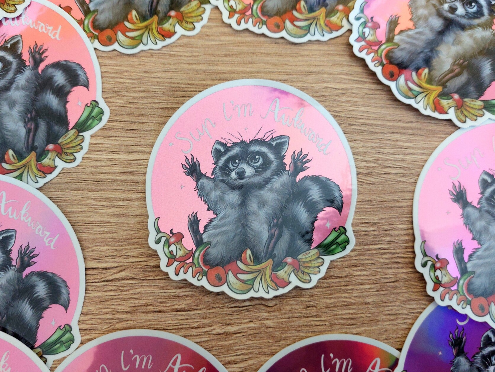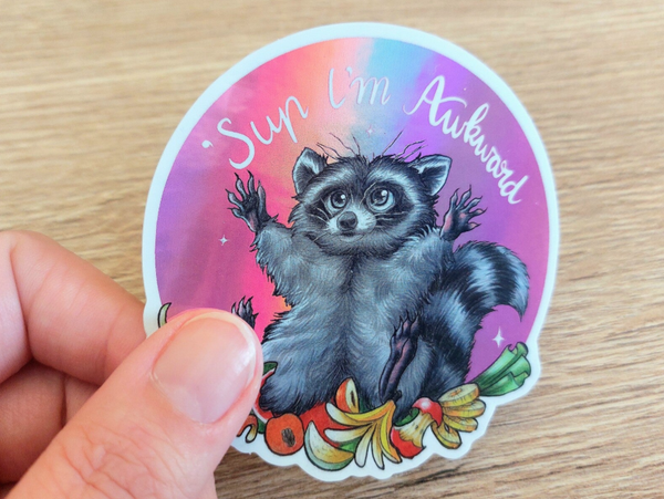 Awkward trashpanda, holografische sticker, vaatwasser proof, 7.8x8 cm (3x3.1 inch)